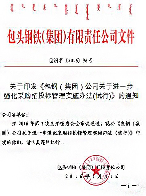 關(guān)于印發(fā)《包鋼(集團(tuán))公司關(guān)于進(jìn)一步強(qiáng)化采購招投標(biāo)管理實施辦法(試行)》的通知