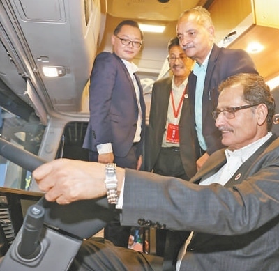 尼泊爾代表在十堰市東風(fēng)商用車品牌體驗中心了解產(chǎn)品信息。劉 旻攝