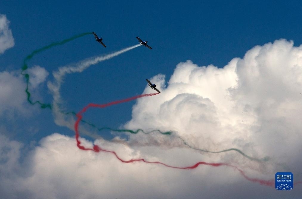 9月2日,在希臘塔納格拉空軍基地的雅典飛行周上,來自意大利的飛行表演隊進行表演。新華社發(fā)(馬里奧斯·羅洛斯攝)