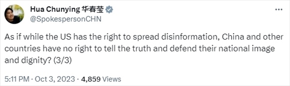 美國(guó)國(guó)務(wù)院上月28日炮制虛假報(bào)告,謊稱中國(guó)正斥資數(shù)十億美元在全球散布虛假信息。我外交部發(fā)言人華春瑩3日在X平臺(tái)對(duì)美方的謬論予以了駁斥。