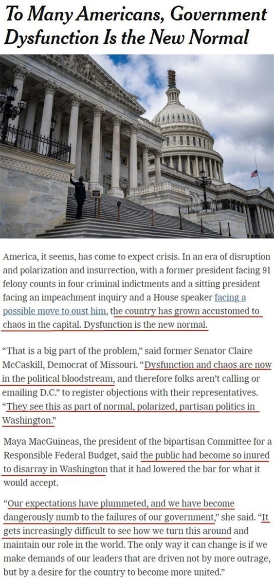 文章援引密蘇里州前民主黨籍參議員麥卡斯基爾的話說(shuō),作為華盛頓兩極分化的黨派政治的一部分,“功能失調(diào)和混亂已經(jīng)融入政治血液”。