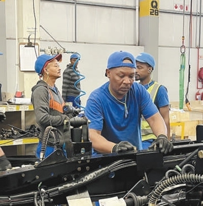 中國(guó)第一汽車集團(tuán)有限公司南非庫(kù)哈工廠生產(chǎn)線上,當(dāng)?shù)貑T工在組裝車輛。本報(bào)記者 鄒 松攝