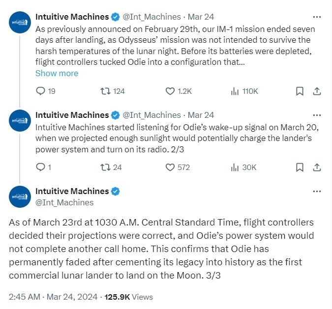 “經(jīng)過(guò)數(shù)天等待,已確認(rèn)‘奧德修斯’電力系統(tǒng)已不能支持它再次完成通信,”聲明寫(xiě)道?!斑@證實(shí)‘奧德修斯’作為首個(gè)由私營(yíng)企業(yè)發(fā)射的月球著陸器永久休眠。”