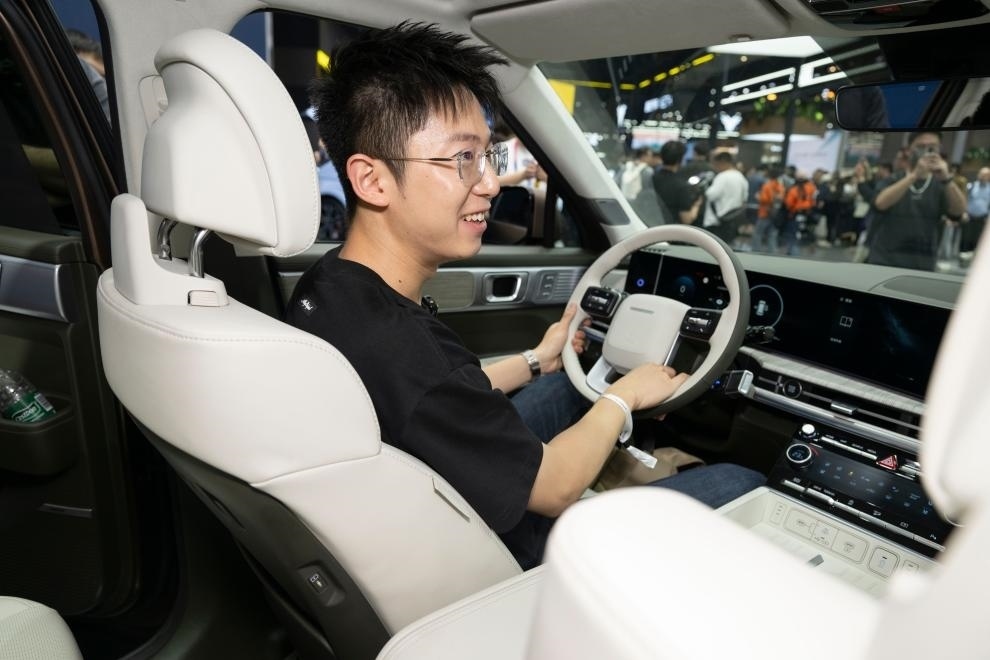 ?4月4日,在巴西圣保羅舉行的巴西防務(wù)展上,參觀者體驗(yàn)一輛經(jīng)過防彈加固的比亞迪海豹電動(dòng)汽車。新華社記者王天聰攝