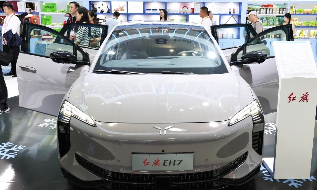?這是在第四屆中國(guó)國(guó)際消費(fèi)品博覽會(huì)上展出的紅旗新能源汽車(2024年4月13日攝)。新華社記者楊冠宇攝
