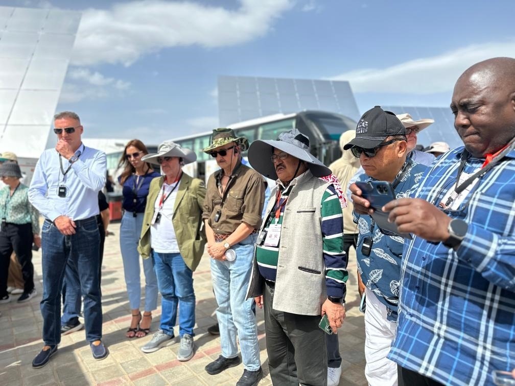 在首航高科敦煌100兆瓦熔鹽塔式光熱電站的吸熱塔前,外交官們對(duì)中國新能源技術(shù)應(yīng)用和產(chǎn)業(yè)發(fā)展表現(xiàn)出極大興趣,一邊提問,一邊用手機(jī)拍攝眼前的震撼場景。