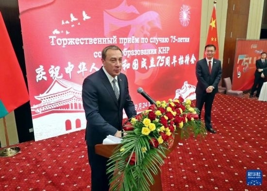 9月24日,白俄羅斯第一副總理尼古拉·斯諾普科夫在明斯克舉行的慶祝中華人民共和國(guó)成立75周年招待會(huì)上致辭。新華社發(fā)(任科夫攝)