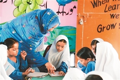 走進(jìn)干凈整潔的校園,讀書聲、嬉戲聲聲聲入耳,孩童的活力、青春氣息撲面而來(lái)。在八年級(jí)的課室里,戴著一條寫有“文學(xué)比賽冠軍”紅綬帶的女學(xué)生薩伊巴·阿斯加爾·阿里成功搶到了回答問(wèn)題的機(jī)會(huì),正在大聲地在全班面前朗誦英語(yǔ)課文。薩伊巴告訴記者,她有7個(gè)姐妹,如果沒(méi)有這所學(xué)校,她可能就沒(méi)學(xué)上了。