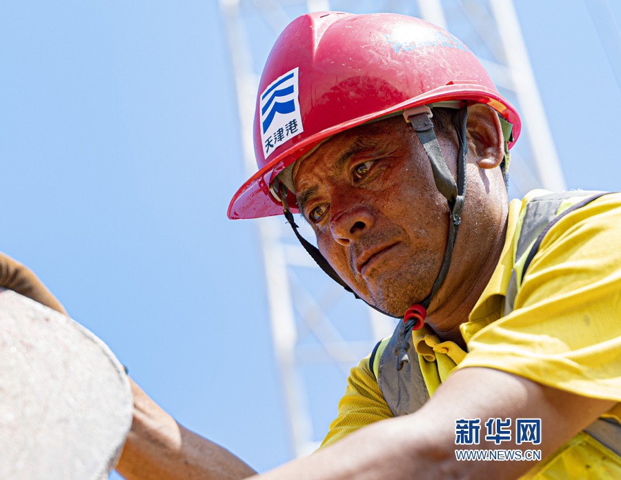 烈日當(dāng)空,建設(shè)工人在天津港c段智能化集裝箱碼頭建設(shè)現(xiàn)場進行安裝樁體工作。新華網(wǎng)發(fā)