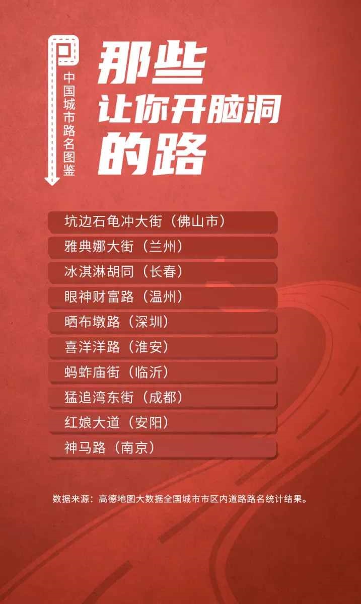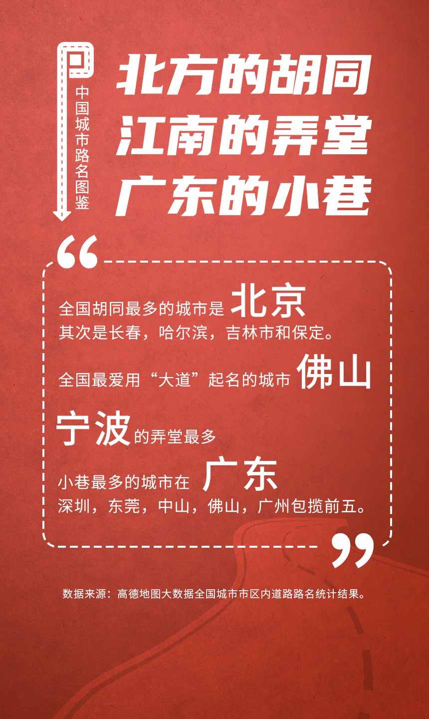 榜單顯示,人民路和建設(shè)路是全國重名率最高的道路,均有129個城市采用。此外,全國胡同最多的城市是北京;弄堂最多的城市是寧波;“小巷”最多的城市都在廣東省,深圳、東莞、中山、佛山和廣州包攬前五;“大道”最多的城市是佛山。