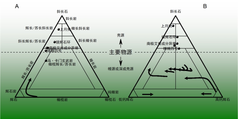 以往對(duì)南極-艾肯盆地物質(zhì)成分的研究大多只注重鎂鐵質(zhì)礦物,由于這一地區(qū)的鎂鐵質(zhì)異常特征,甚至引發(fā)了有關(guān)月幔是橄欖巖還是輝石巖的爭論。雖然根據(jù)月球巖漿洋假說,橄欖石和輝石是月幔的主要礦物,但是月殼形成之后的深成巖漿侵入作用同樣能夠在月殼中形成富集橄欖石或輝石的巖石,因此富集橄欖石或輝石并不能作為源自月幔的證據(jù)。迄今人類還沒有獲取南極-艾肯盆地的樣品返回地球,無法獲知其微量元素和同位素特征,通過遙感或原位探測可獲得的物質(zhì)成分信息中,斜長石含量也是區(qū)分殼源和幔源巖石的關(guān)鍵指標(biāo)。