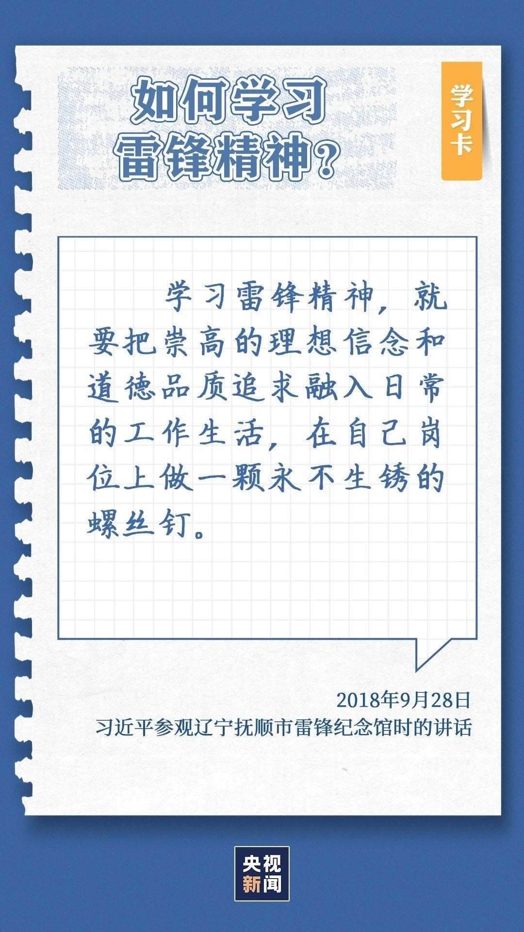 中共中央總書(shū)記、國(guó)家主席、中央軍委主席習(xí)近平近日作出重要指示指出,今年是毛澤東等老一輩革命家為雷鋒同志題詞60周年。60年來(lái),學(xué)雷鋒活動(dòng)在全國(guó)持續(xù)深入開(kāi)展,雷鋒的名字家喻戶曉,雷鋒的事跡深入人心,雷鋒精神滋養(yǎng)著一代代中華兒女的心靈。實(shí)踐證明,無(wú)論時(shí)代如何變遷,雷鋒精神永不過(guò)時(shí)。在新時(shí)代新征程上,如何弘揚(yáng)雷鋒精神?點(diǎn)擊學(xué)習(xí)卡↓