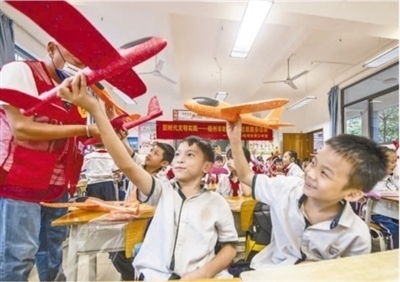 廣西壯族自治區(qū)梧州市的一所小學內,學生正在上趣味航模科技課。何華文攝(影像中國)