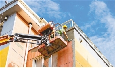 工人在內蒙古自治區(qū)呼和浩特市玉泉區(qū)石東路街道一老舊小區(qū)改造升級現(xiàn)場進行外墻真石漆施工作業(yè)。丁根厚攝(人民視覺)