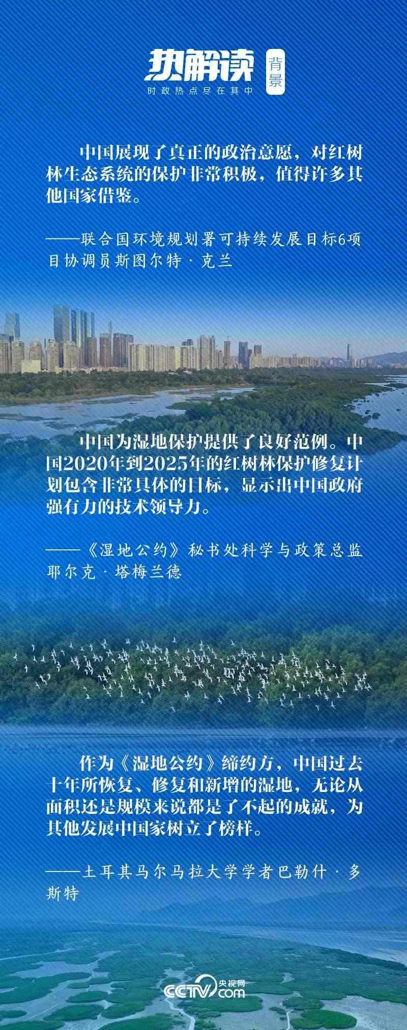2022年11月5日,習(xí)近平主席以視頻方式出席《濕地公約》第十四屆締約方大會開幕式并發(fā)表致辭,他向世界宣布中國將在深圳建立“國際紅樹林中心”。海內(nèi)外輿論認(rèn)為,此舉充分體現(xiàn)了中國對沿海生態(tài)特別是紅樹林保護(hù)的關(guān)心和重視。