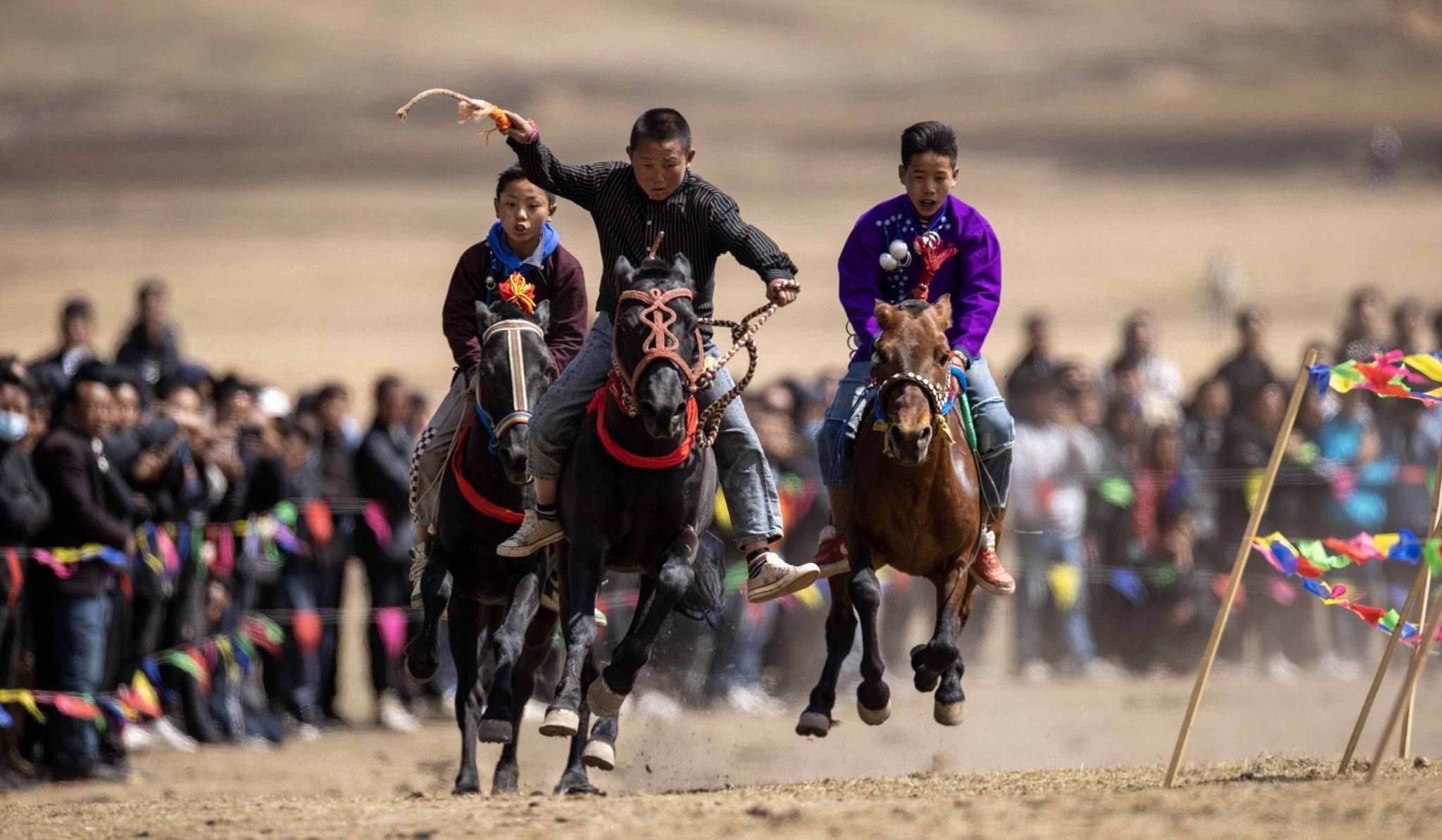 2023年4月25日,四川涼山,普格縣黎安鄉(xiāng)??诹鹤樱瑐鹘y(tǒng)的彝族賽馬比賽拉來帷幕。視覺中國