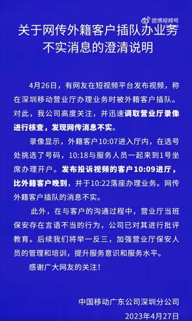 ·深圳移動(dòng)否認(rèn)“外籍客戶(hù)插隊(duì)”:調(diào)錄像核查,發(fā)布投訴視頻的客戶(hù)晚到。