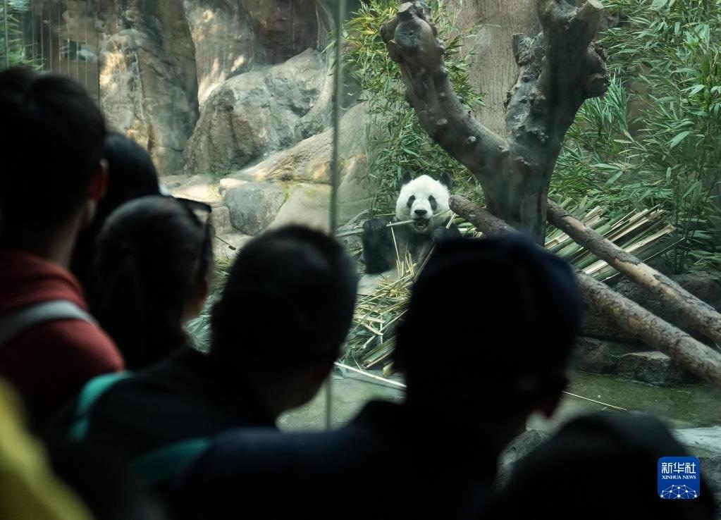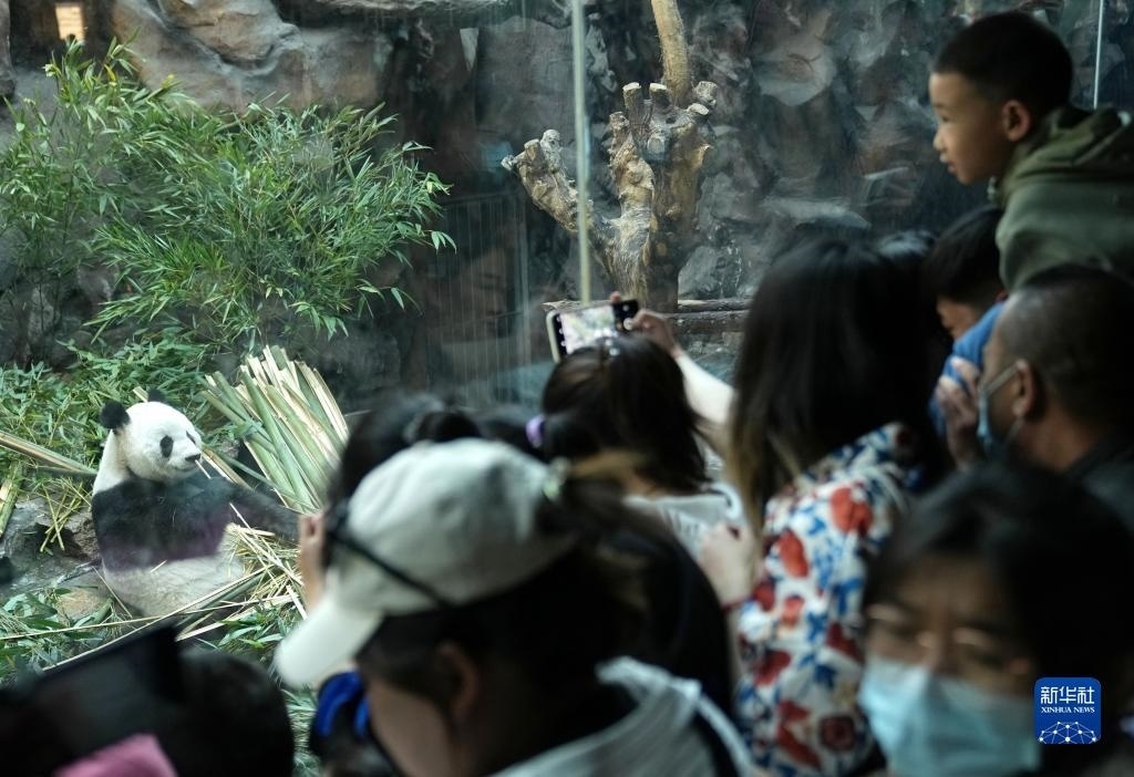 4月30日,游客在北京動物園大熊貓館觀賞大熊貓。