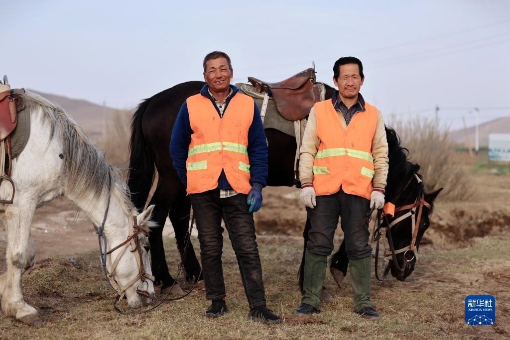 5月2日,河北省承德市豐寧滿族自治縣大灘鎮(zhèn)扎拉營村的護林員趙世海(右)和羅金寶在海留圖國家濕地公園修復(fù)護欄。