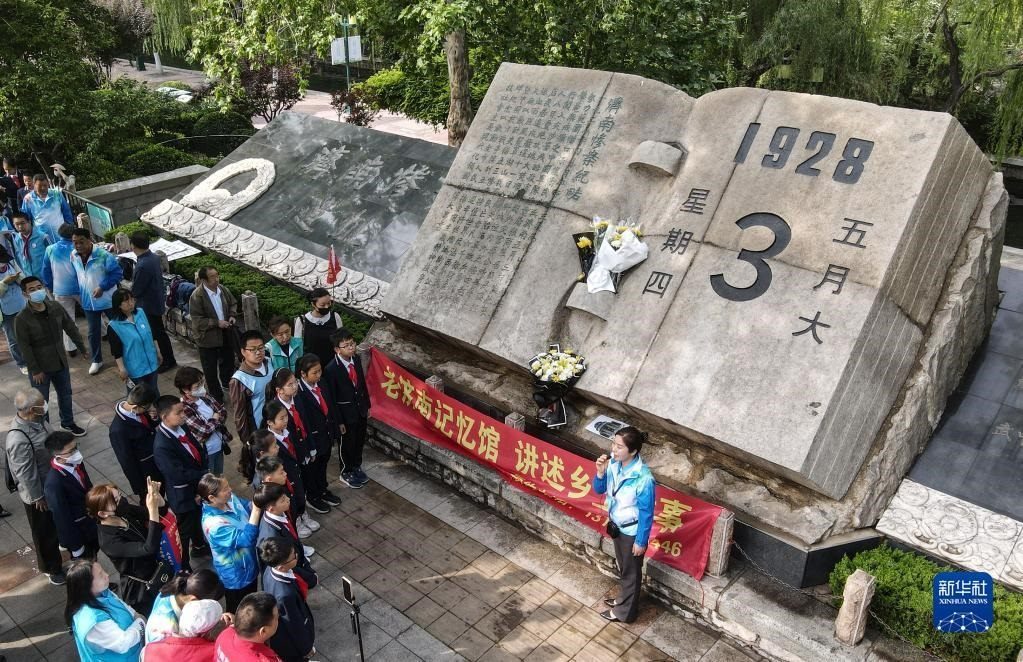 5月3日,志愿者在“五三慘案”紀念碑前為市民講述歷史(無人機照片)。