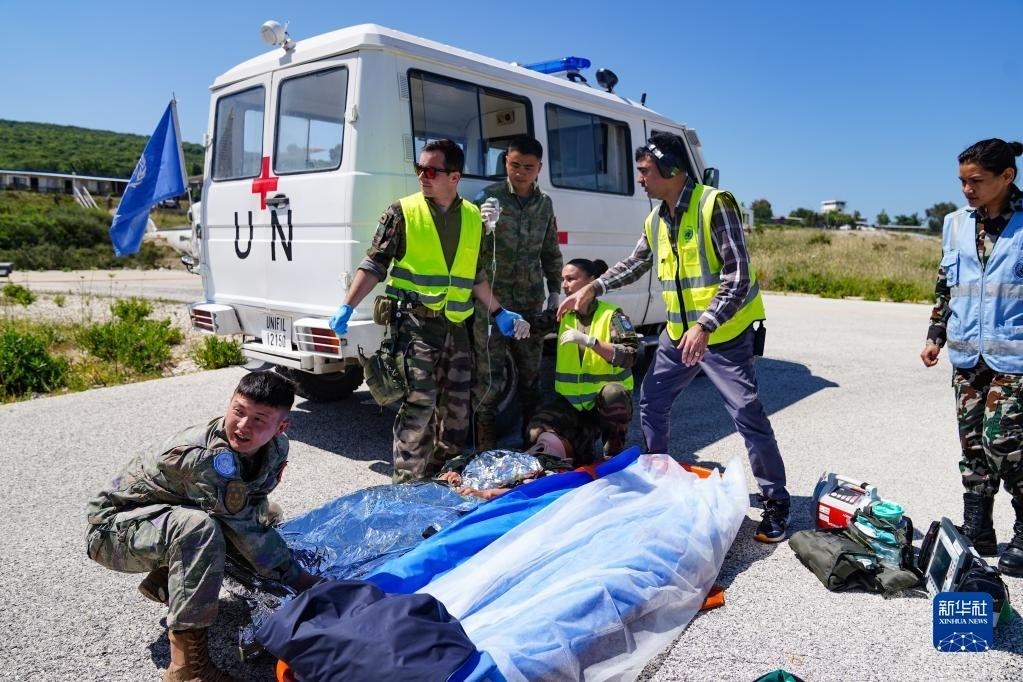 5月3日,在黎巴嫩南部邊境“藍(lán)線”附近雷場,參與演習(xí)的中國第21批赴黎巴嫩維和多功能工兵分隊(duì)隊(duì)員同外軍醫(yī)療分隊(duì)交接。