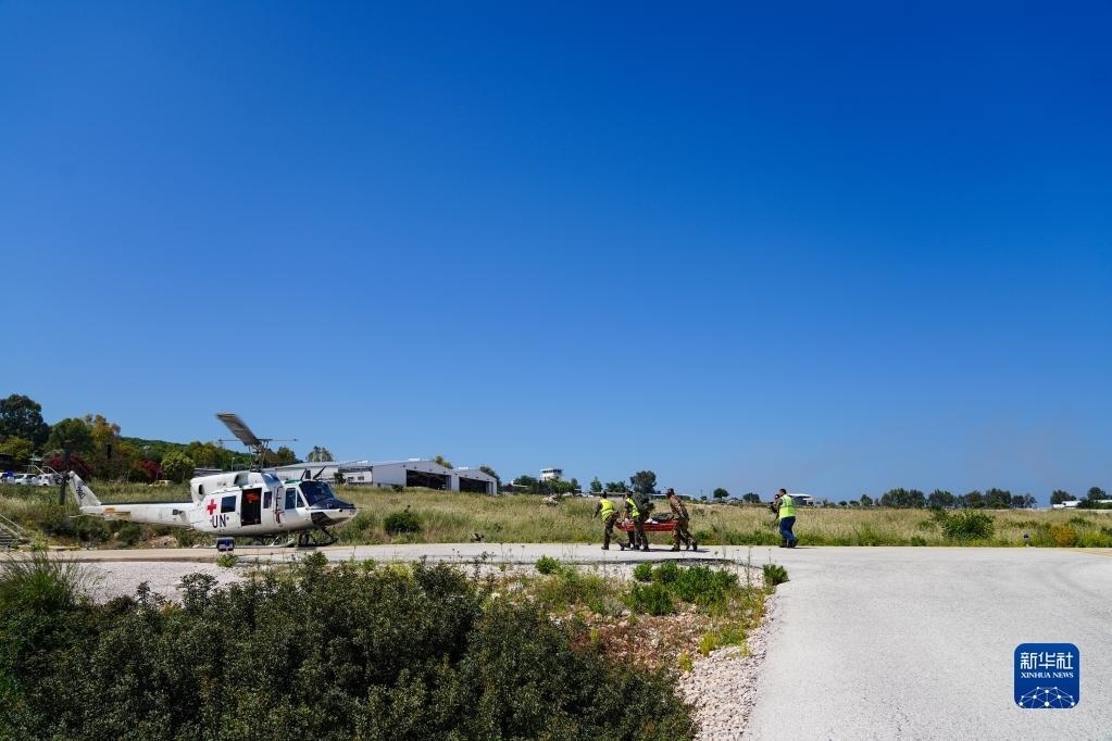 5月3日,在黎巴嫩南部邊境“藍(lán)線”附近雷場,參與演習(xí)的中國第21批赴黎巴嫩維和多功能工兵分隊(duì)隊(duì)員使用救援直升機(jī)轉(zhuǎn)運(yùn)“傷員”。