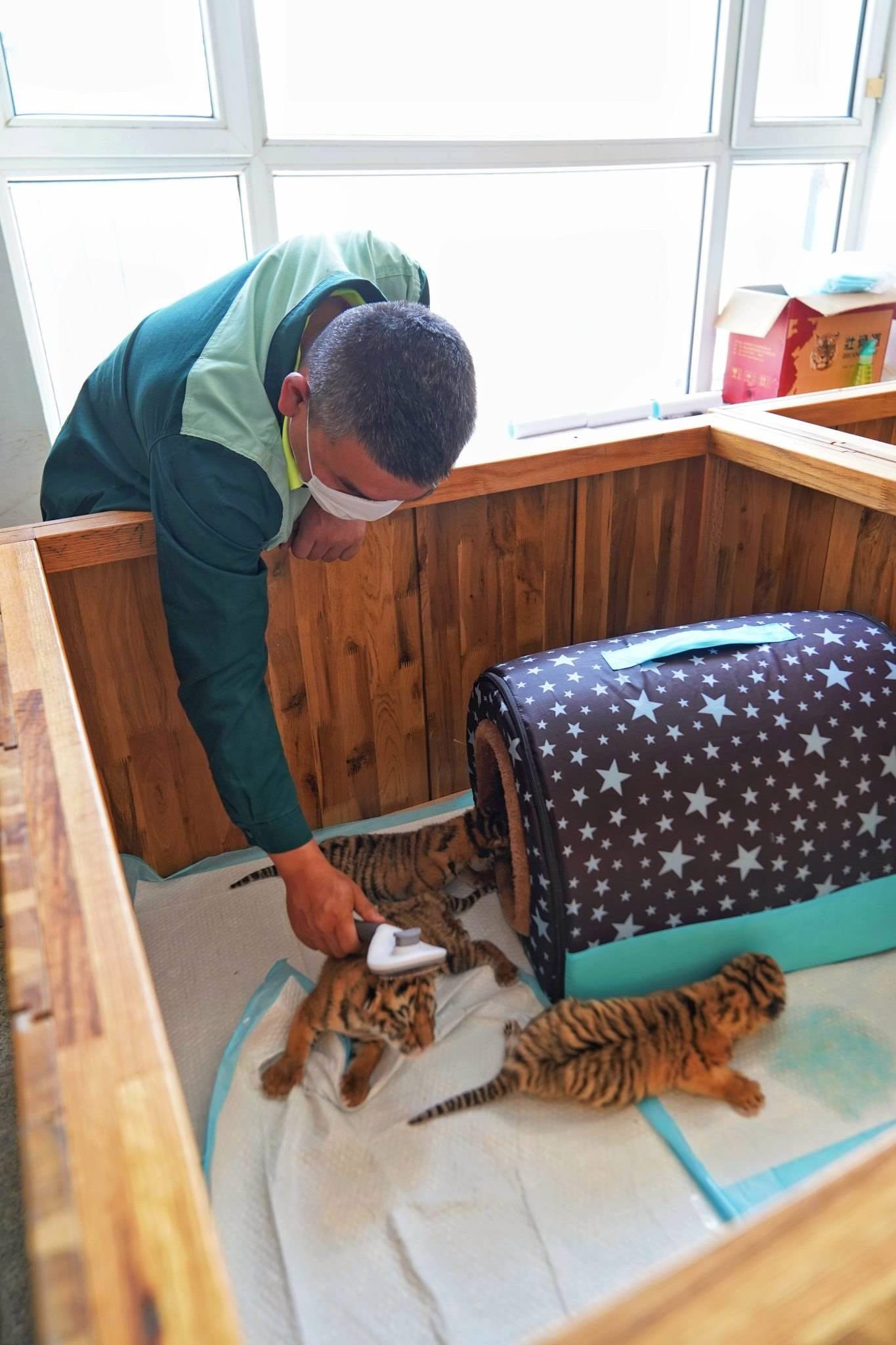 近日,14只東北虎幼崽降生黑龍江東北虎林園。據(jù)飼養(yǎng)員介紹,目前幼虎們身體狀況均良好,待產(chǎn)室內(nèi)還有多只母虎即將在本月生產(chǎn)。視覺中國