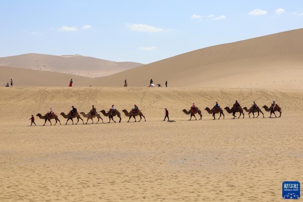5月11日,游客在鳴沙山月牙泉景區(qū)騎駱駝觀光。