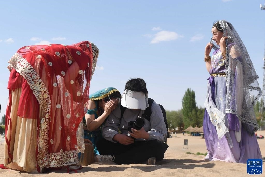 5月11日,游客在鳴沙山月牙泉景區(qū)體驗旅拍項目。