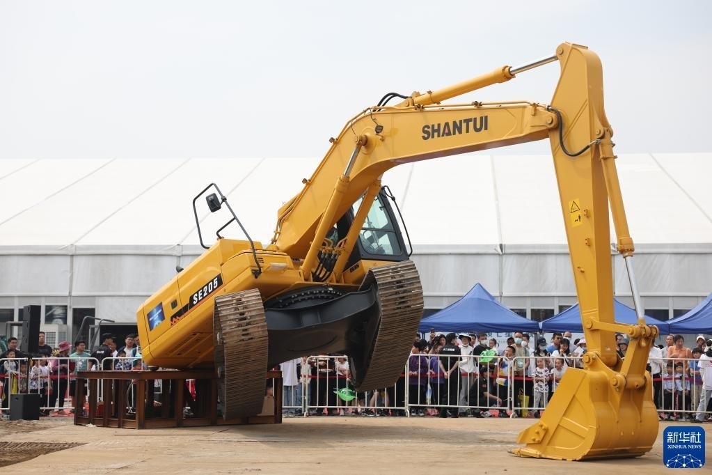5月13日,在長沙國際工程機械展覽會上,機手駕駛挖掘機表演。