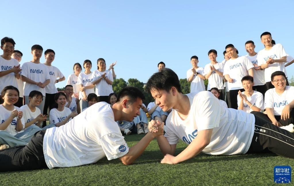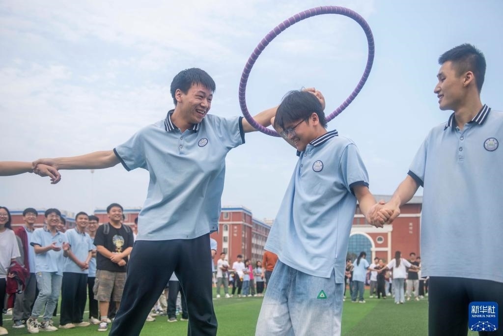 5月25日,在湖南省永州市道縣道州玉潭(東陽)學(xué)校,高三學(xué)生在操場上做減壓趣味活動(dòng)。