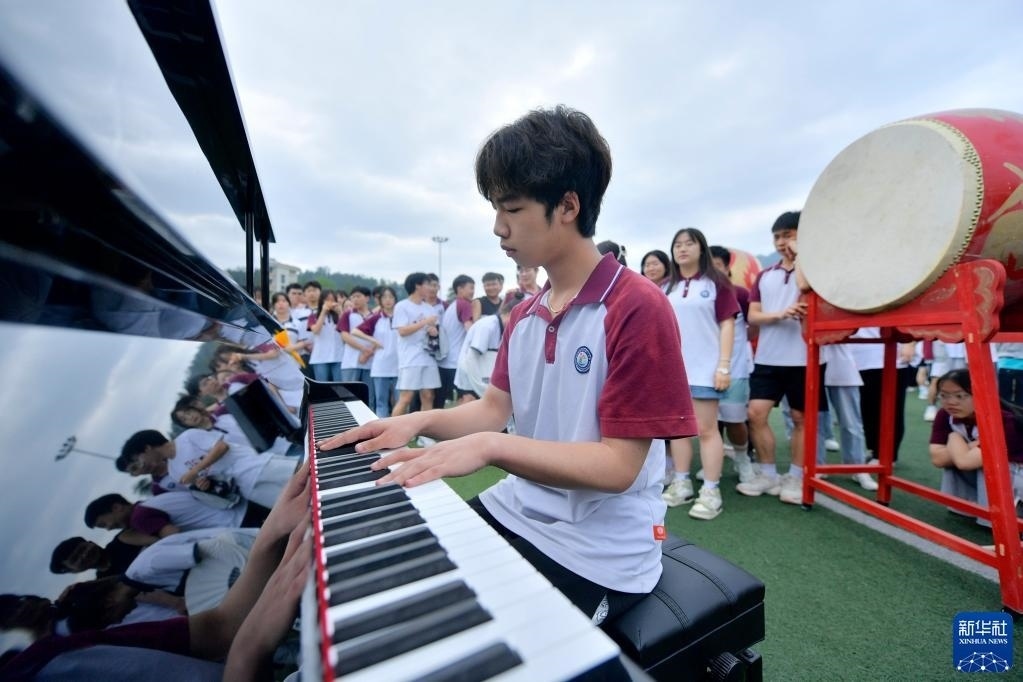 5月29日,在湖北省宣恩縣第一高級(jí)中學(xué)的快閃活動(dòng)現(xiàn)場,學(xué)生在彈奏鋼琴。