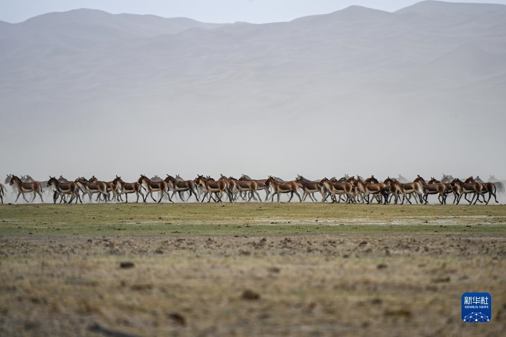 一群藏野驢在阿爾金山國家級自然保護區(qū)奔跑(5月23日攝)。
