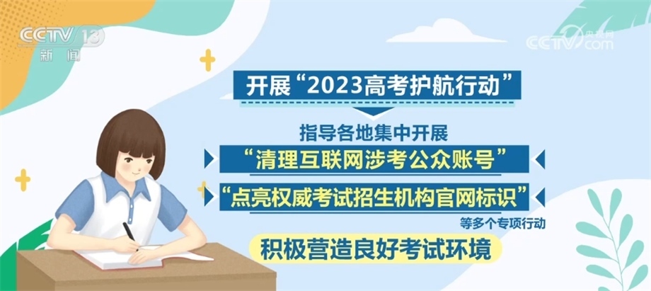 此外,將繼續(xù)開展“2023高考護航行動”,指導各地集中開展“清理互聯(lián)網(wǎng)涉考公眾賬號”“點亮權威考試招生機構官網(wǎng)標識”等多個專項行動,積極營造良好考試環(huán)境。