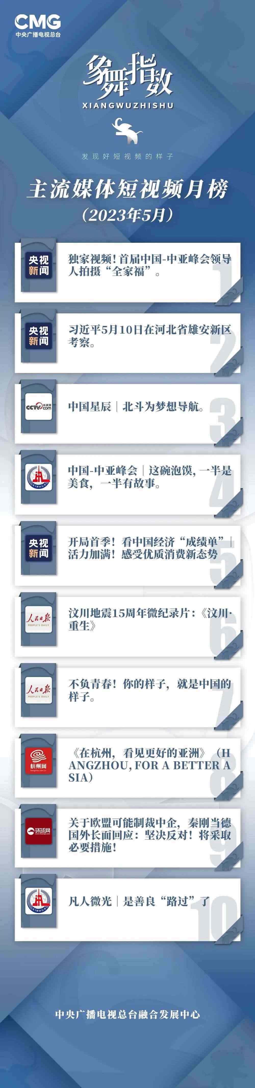 中央廣播電視總臺“象舞指數”評議品牌,推出主流媒體短視頻月榜、總臺短視頻月榜。在2023年5月,這些內容引發(fā)大眾關注: