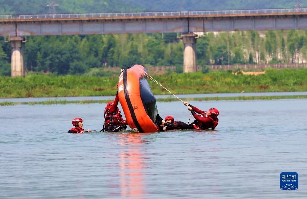 當(dāng)日,在浙江省湖州市長(zhǎng)興縣合溪水庫(kù)煤山段,煤山鎮(zhèn)組織黨員干部、應(yīng)急管理隊(duì)員、志愿者組成應(yīng)急救援隊(duì),開展防汛減災(zāi)應(yīng)急綜合實(shí)戰(zhàn)演練,通過(guò)沖鋒舟編隊(duì)、水上打撈、水上救援等課目訓(xùn)練,增強(qiáng)防汛應(yīng)急處置和水上搶險(xiǎn)救災(zāi)能力。新華社發(fā)(許旭 攝)