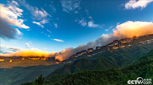 重慶市南川區(qū)金佛山北坡主峰,流云、流瀑、晚霞、落日交相輝映,壯美如畫(huà)。