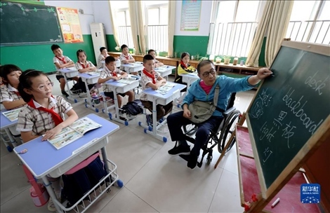 今年48歲的楊季剛是山東省棗莊市永安鎮(zhèn)遺棠小學(xué)一名鄉(xiāng)村教師,從教已28年。2017年初,楊季剛因意外摔成重傷,終生將與輪椅為伴。靠著頑強(qiáng)的毅力,歷經(jīng)康復(fù)訓(xùn)練的艱辛,2018年秋季楊季剛?cè)缙诨氐搅诵@,在特制1米高的小黑板上頑強(qiáng)地續(xù)寫(xiě)他的教師生涯。
