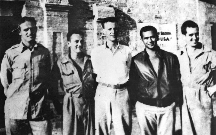 二戰(zhàn)期間,被新四軍營(yíng)救的5名美國(guó)飛虎隊(duì)飛行員在新四軍駐地合影(1944年8月攝)。新華社發(fā)