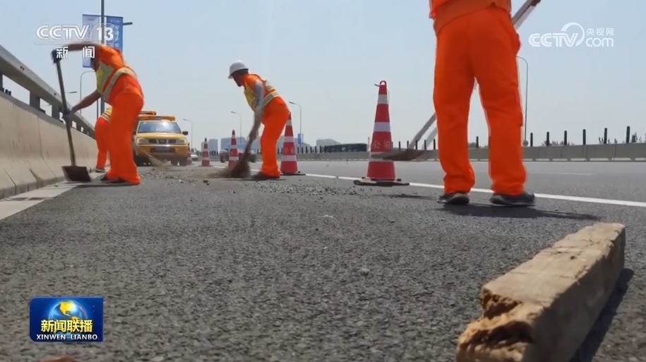 這兩天,北京持續(xù)高溫。在廣渠快速路上,道路養(yǎng)護工人正頂著烈日清理過往車輛遺撒的沙石。由于地面溫度高,這些沙石極容易引起車輛爆胎。