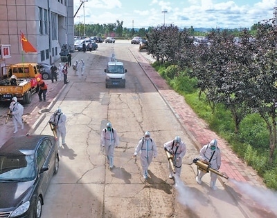 8月8日,黑龍江省尚志市,工作人員對洪水過后的道路進行消毒。張藝開 尚鵬程攝影報道