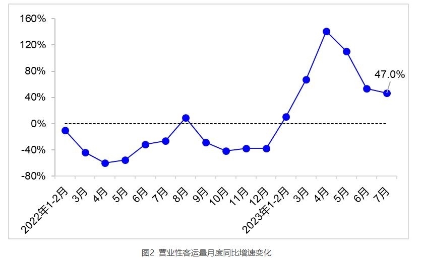 營(yíng)業(yè)性客運(yùn)方面,7月完成營(yíng)業(yè)性客運(yùn)量9.1億人,同比增長(zhǎng)47.0%。其中,完成公路客運(yùn)量4.1億人,同比增長(zhǎng)19.3%;完成水路客運(yùn)量3034萬人,同比增長(zhǎng)78.3%。1—7月,完成營(yíng)業(yè)性客運(yùn)量52.3億人,同比增長(zhǎng)54.6%。其中,完成公路客運(yùn)量25.5億人,同比增長(zhǎng)18.7%;完成水路客運(yùn)量1.5億人,同比增長(zhǎng)128.8%。?