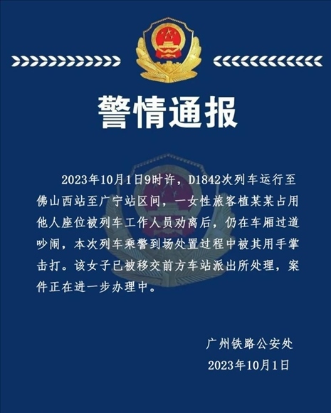 ·廣州警方通報女子高鐵占座掌摑乘警:已被移交派出所處理。