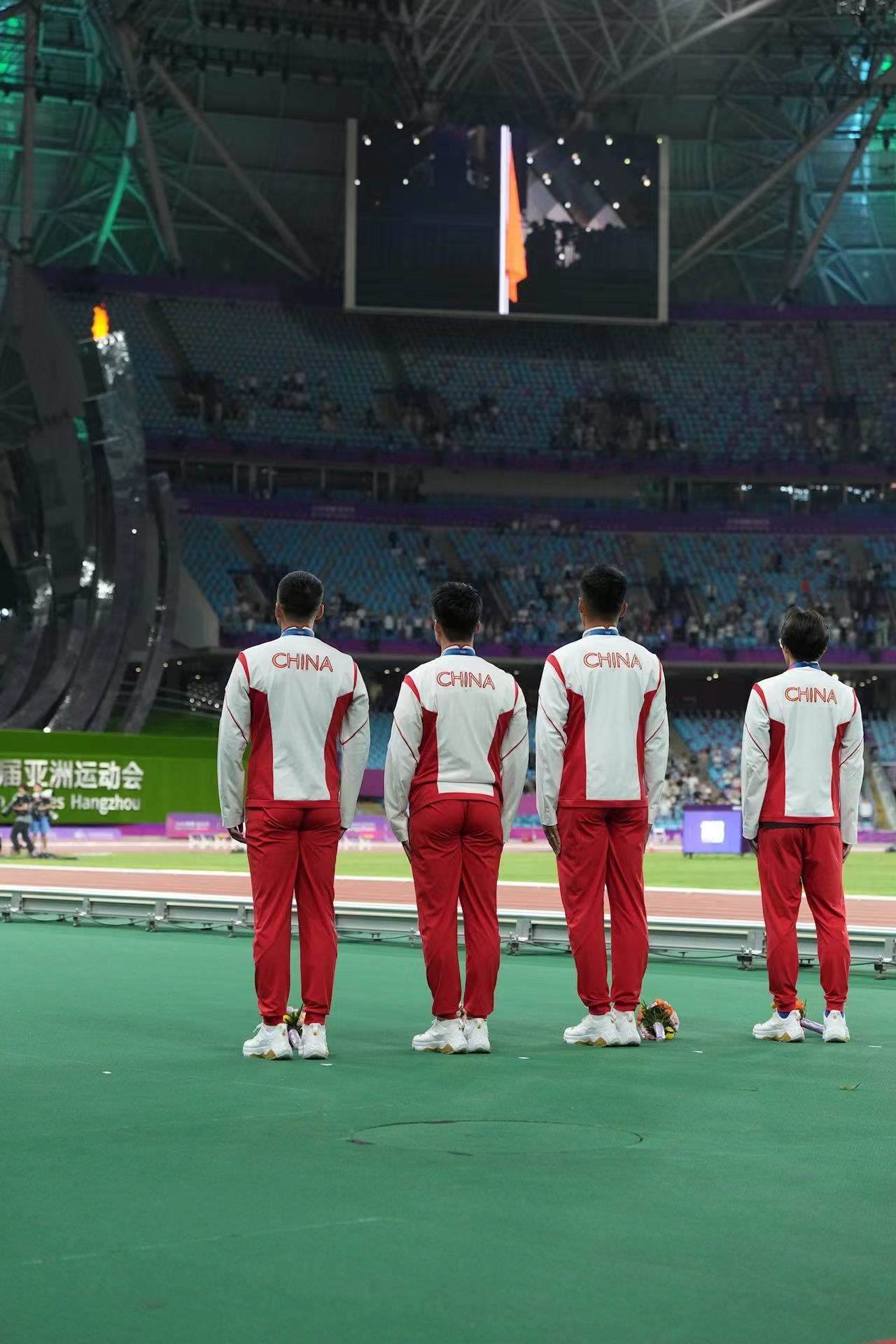 補發(fā)現(xiàn)場,首先頒發(fā)的是男子4×100米接力銅牌。四位中國小伙子笑著走上銅牌領(lǐng)獎臺,接受頒獎。隨后的競走頒獎儀式上,在三位得獎運動員獲頒獎牌后,《義勇軍進(jìn)行曲》奏響,三面五星紅旗冉冉升起,切陽什姐眼中涌動著晶瑩的淚花。