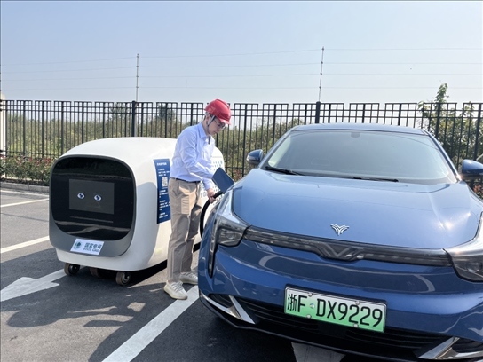 ?2023年10月17日,國網浙江電力工作人員在烏鎮(zhèn)使用首臺智能移動充電機器人為新能源汽車充電。新華網發(fā) 沈佳煒 攝