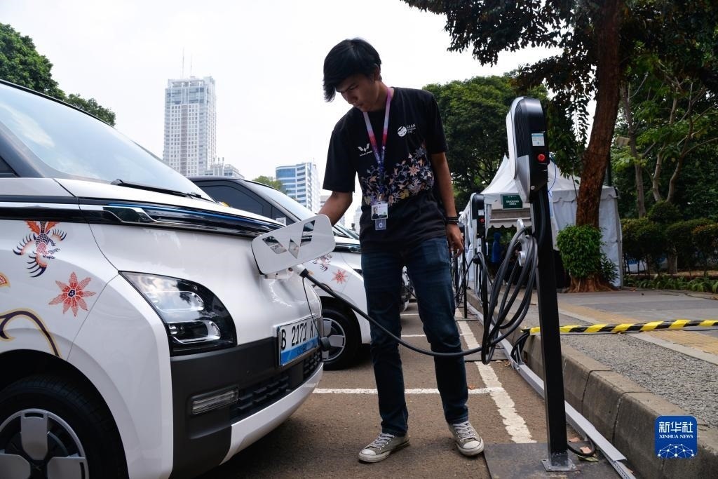 9月29日,在印度尼西亞雅加達(dá)一家商場的地下停車場,工作人員為一位五菱新能源車Air ev車主結(jié)束充電。新華社記者 徐欽 攝