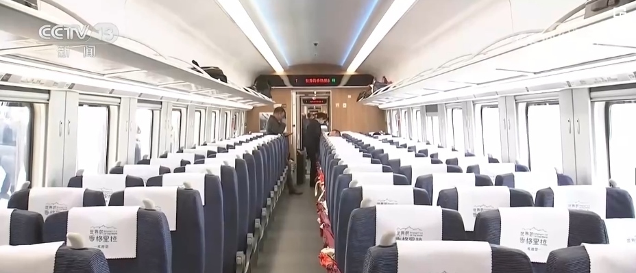 總臺記者 劉文杰:這是一款特別針對滇藏鐵路沿線高原、高寒環(huán)境設(shè)計的動車組。整列車的涂裝是以“中國紅”為腰帶、以“國槐綠”為窗帶,用“長城灰”進行點綴,整體外觀大氣優(yōu)美。