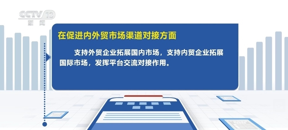 在促進內(nèi)外貿(mào)市場渠道對接方面,支持外貿(mào)企業(yè)拓展國內(nèi)市場,支持內(nèi)貿(mào)企業(yè)拓展國際市場,發(fā)揮平臺交流對接作用。