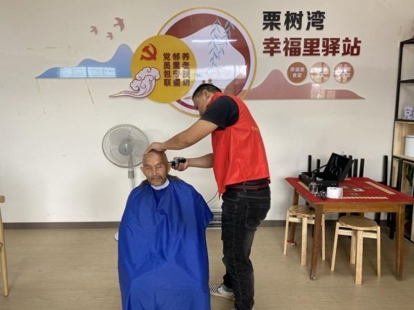 荊門市東寶區(qū)栗溪鎮(zhèn)栗樹(shù)灣村留守老人在“養(yǎng)老服務(wù)驛站”享受免費(fèi)理發(fā)服務(wù)