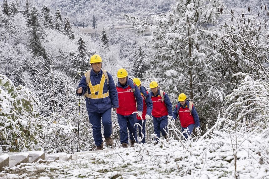 2月9日,在彭水縣中嶺山,國網(wǎng)重慶電力員工對(duì)電力線路開展冰雪特巡。牟偉攝